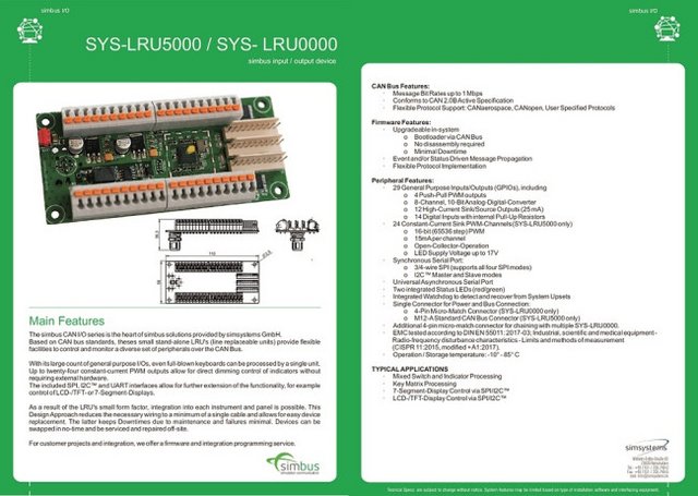 The simbusCANI/O series is the heart of simbus solutions provided by simsystems GmbH. Based on CAN bus standards, theses small stand-alone LRU's (line replaceable units) provide flexible facilities to control and monitor a diverse set of peripherals over theCANBus. With its large count of general purpose I/Os, even full-blown keyboards can be processed by a single unit. Up to twenty-four constant-current PWM outputs allow for direct dimming control of indicators without requiring external hardware. The included SPI, I2C™ and UART interfaces allow for further extension of the functionality, for example control of LCD-/TFT- or 7-Segment-Displays. As a result of the LRU's small form factor, integration into each instrument and panel is possible. This DesignApproach reduces the necessary wiring to a minimum of a single cable and allows for easy device replacement. The latter keeps Downtimes due to maintenance and failures minimal. Devices can be swapped in no-time and be serviced and repaired off-site. For customer projects and integration, we offer a firmware and integration programming service.